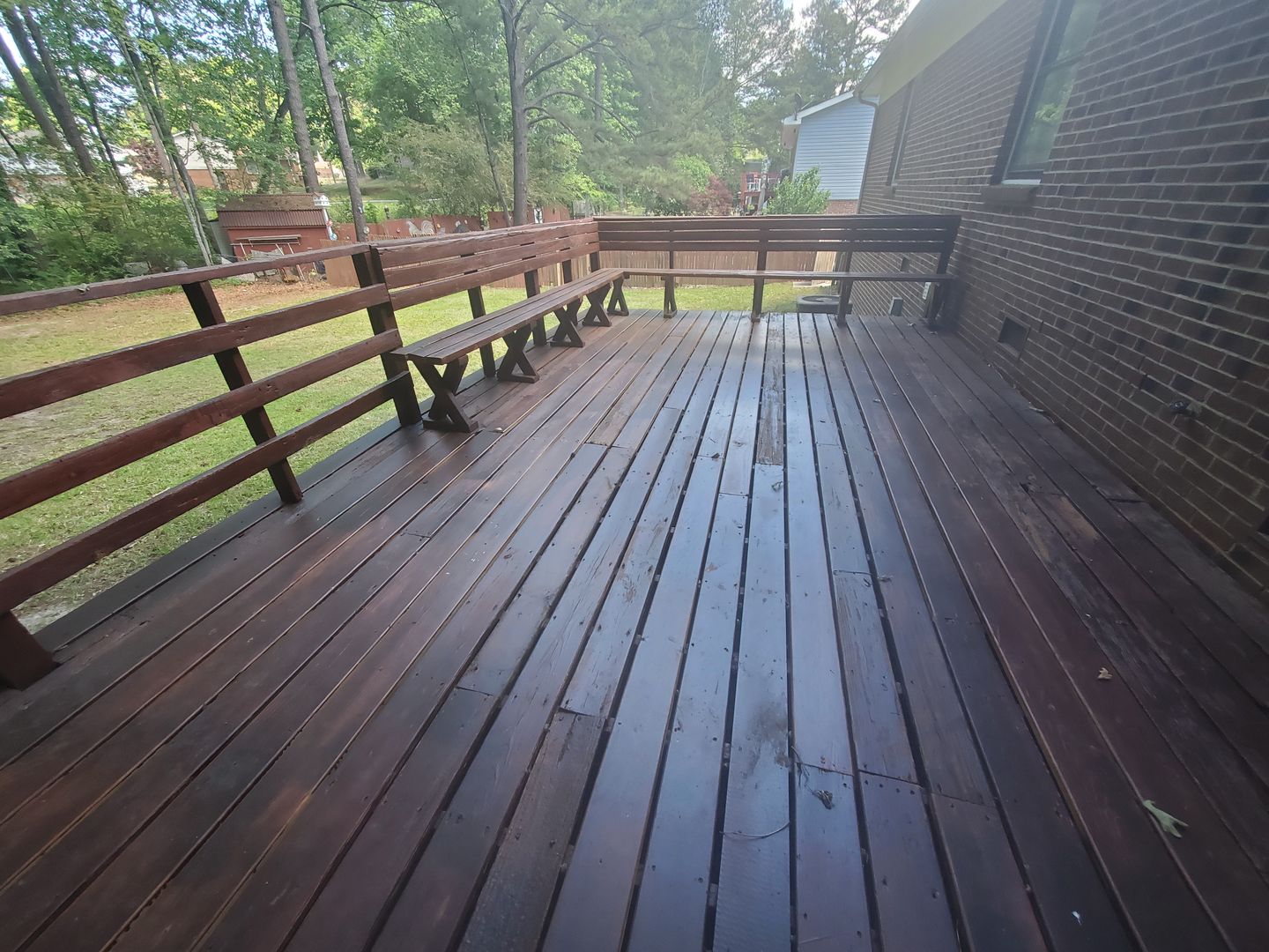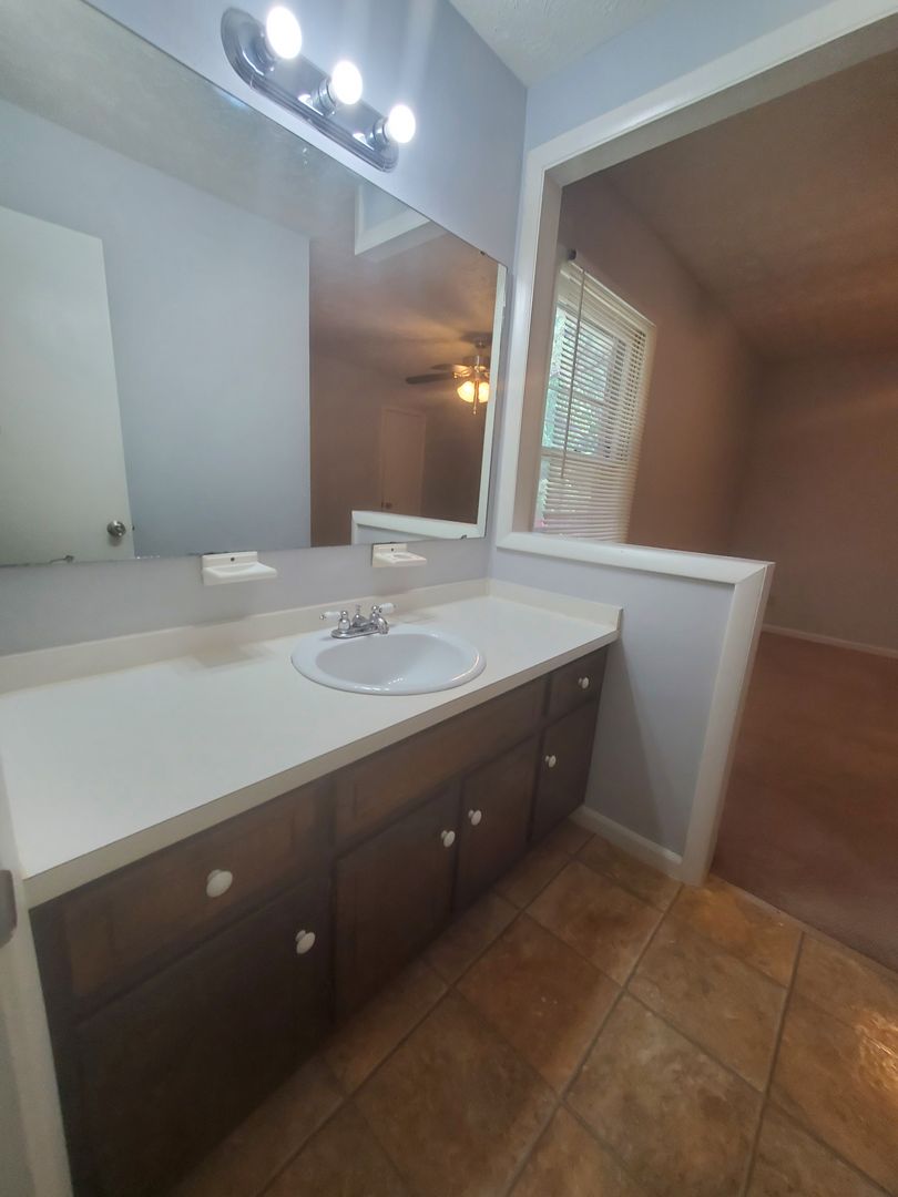 The welcoming foyer flows into the living room. The kitchen is equipped with some stainless appliances. The large den has plush carpeting and give access to the back yard. A laundry room comes with convenient washer and dryer hookups. Outside, you'll find a fenced backyard, a covered front porch, and a back deck with seating, perfect for outdoor relaxation or entertaining. The home is kept comfortable year-round with a heat pump for heating and central A/C. The property also includes some window treatments and ceiling fans. Experience the perfect blend of comfort and convenience.