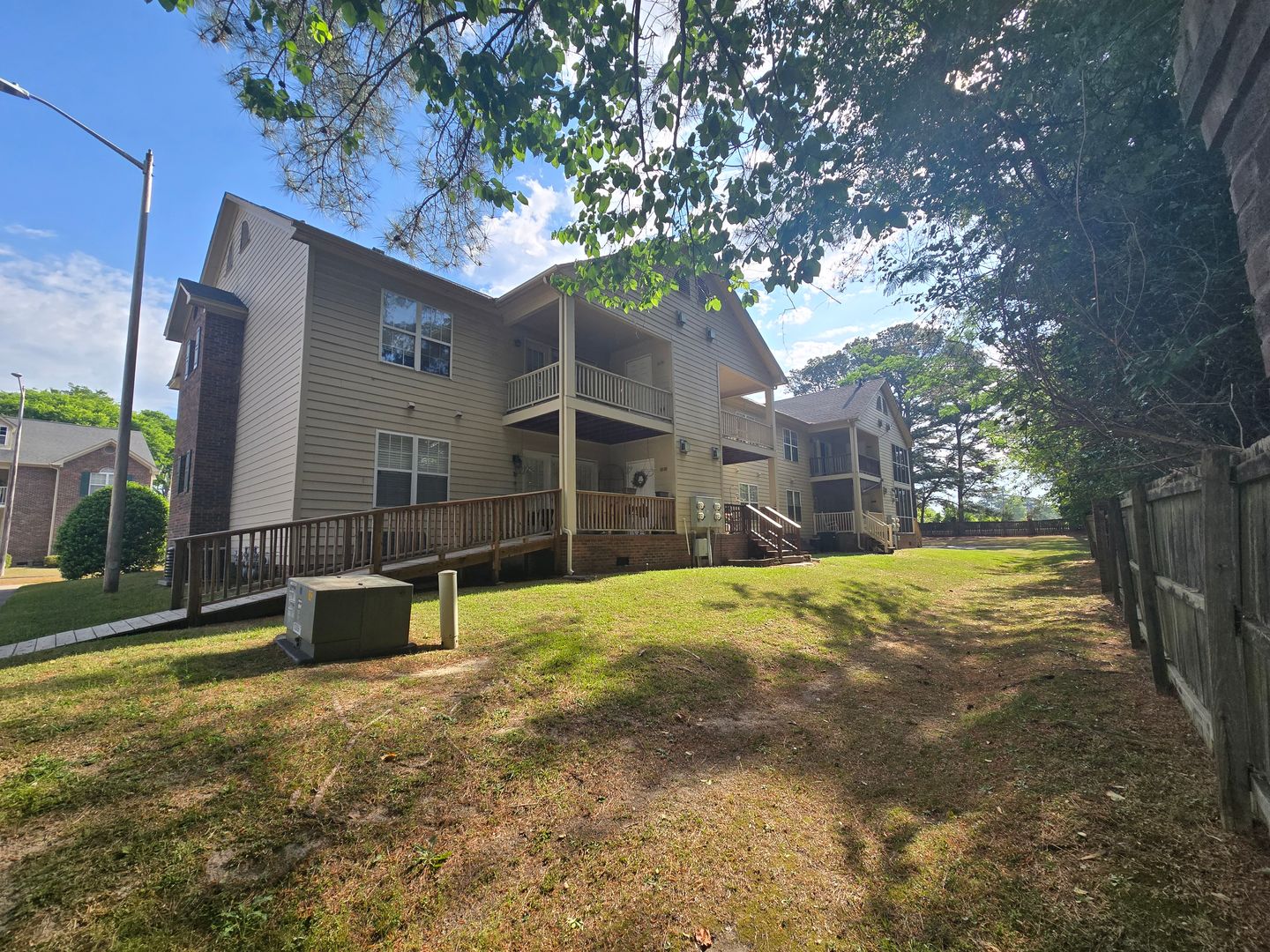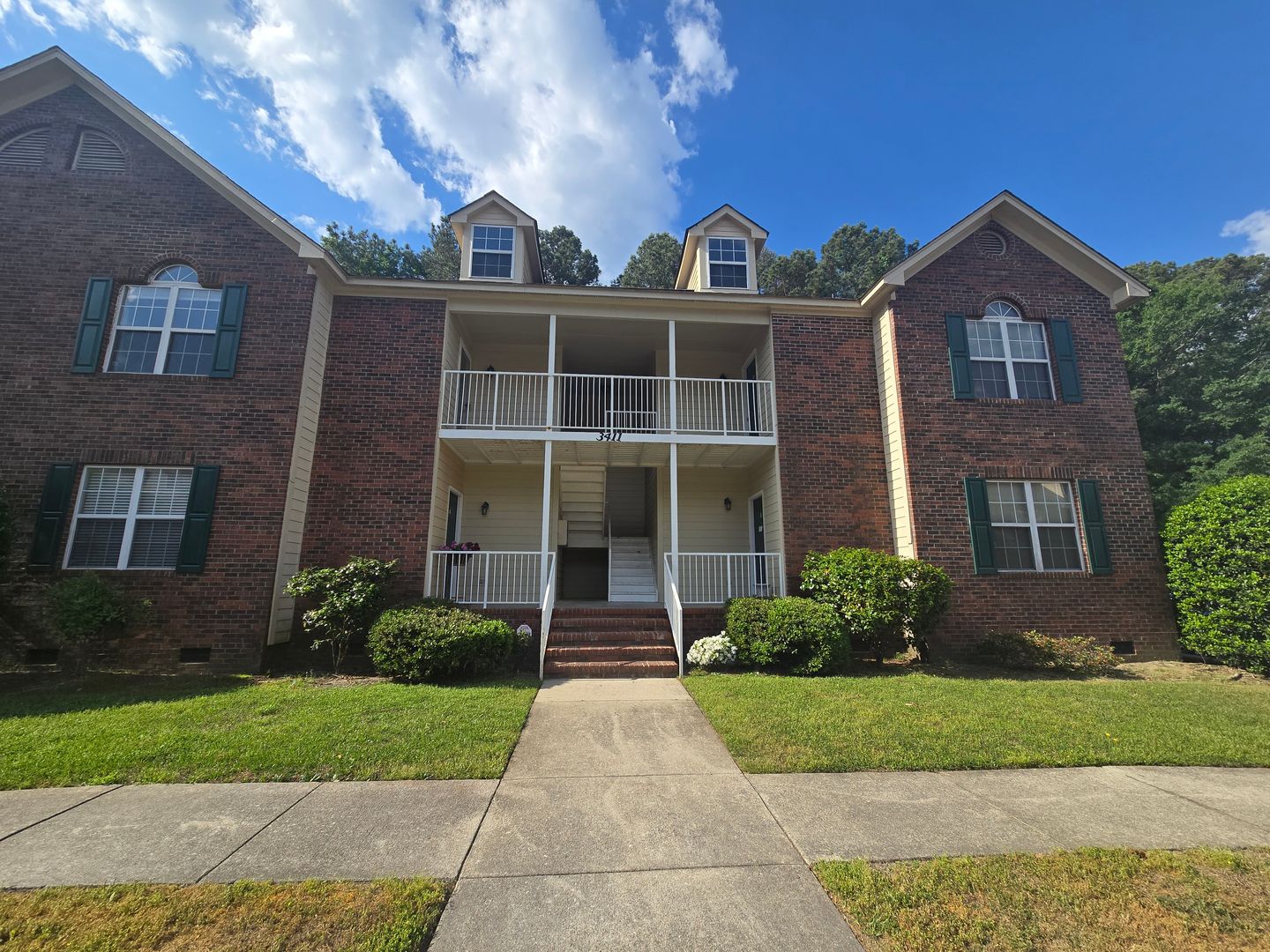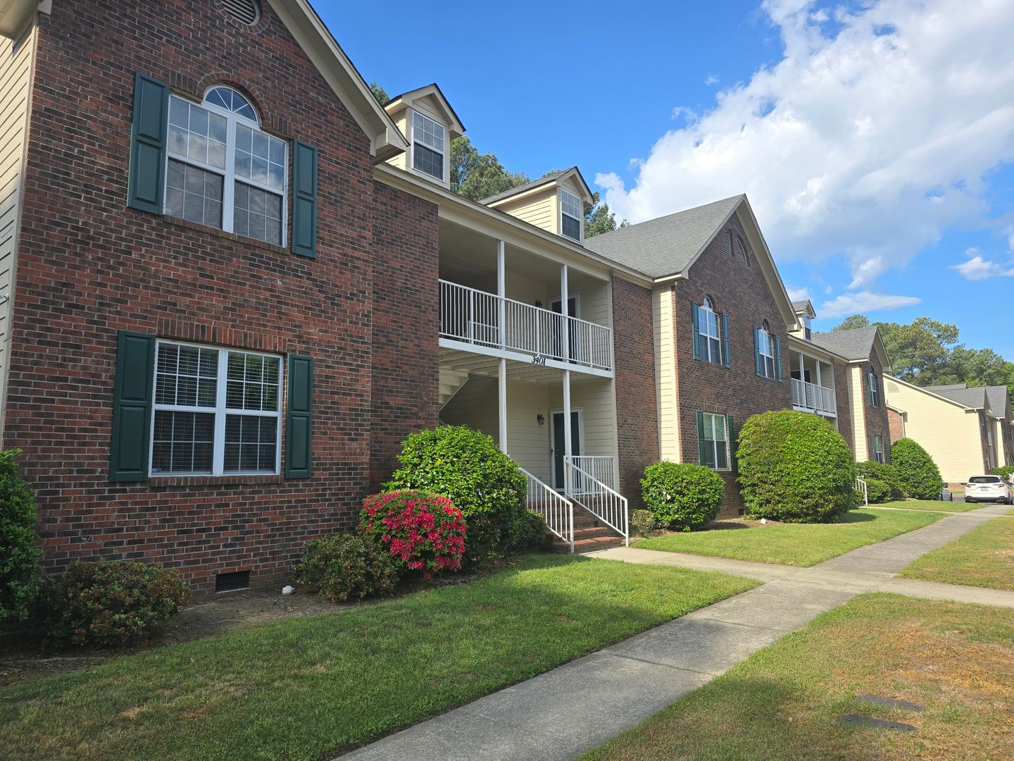 Welcome to this well-maintained 2-bedroom, 2-bath condo in Fayetteville, NC. The layout includes a foyer leading to a living/dining area with a gas-log fireplace and laminate and tile flooring throughout. The kitchen features stainless-steel appliances and nearby storage options, plus outside storage for added convenience. The primary suite offers a large closet and a garden tub/shower combo. Additional highlights include ceiling fans, some window treatments, a covered front porch, a balcony, storm doors, a washer & dryer (NOT WARRANTED) and a heat pump for heating with central A/C. This property combines practical indoor features with outdoor spaces to suit a variety of needs.