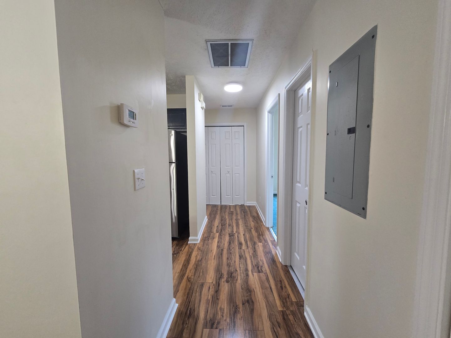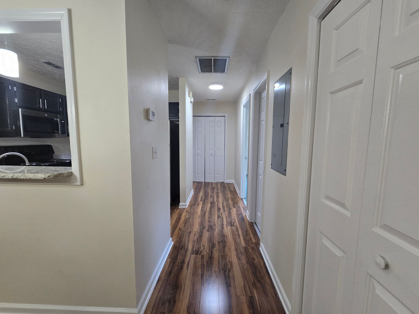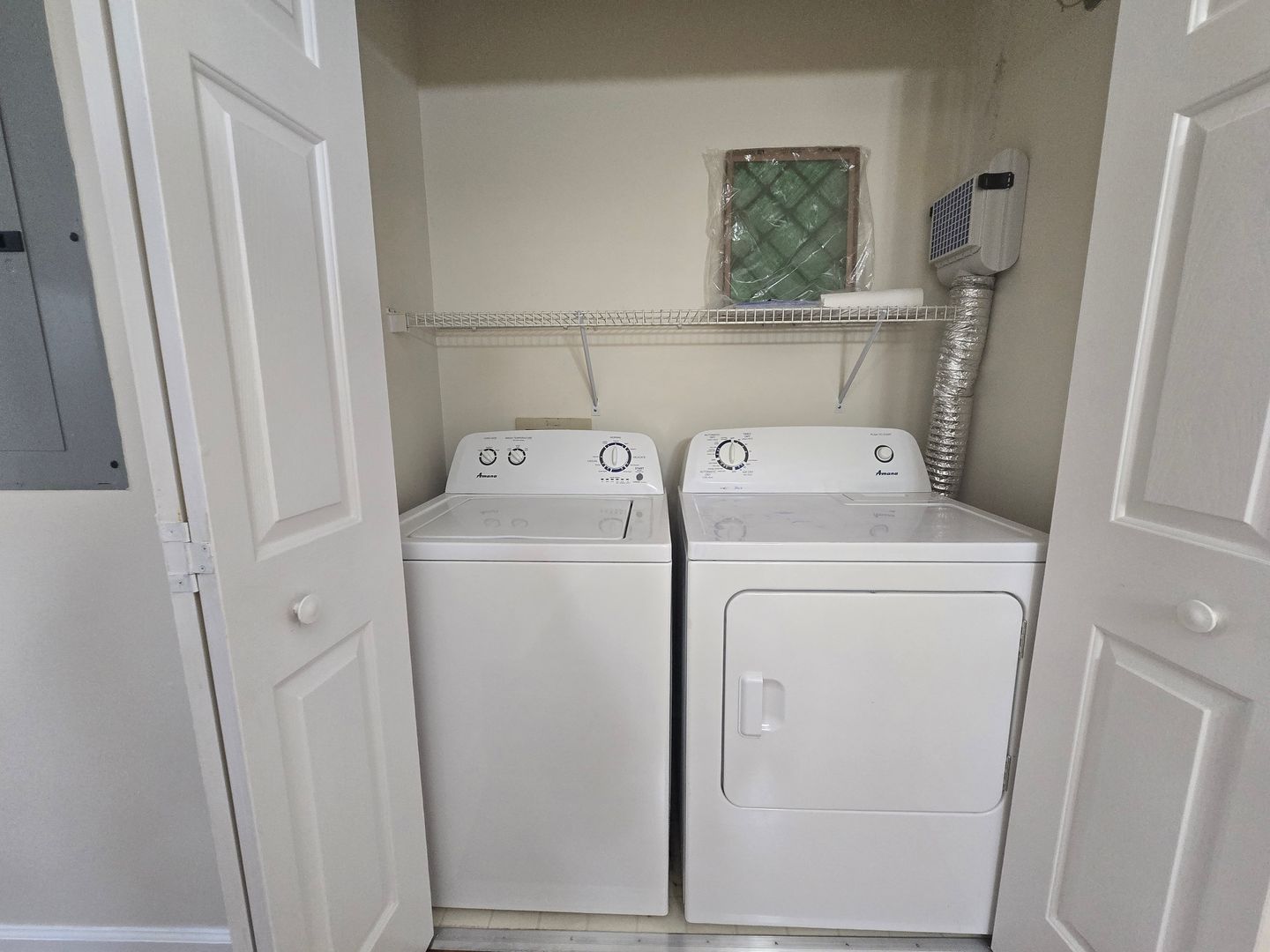 Welcome to this well-maintained 2-bedroom, 2-bath condo in Fayetteville, NC. The layout includes a foyer leading to a living/dining area with a gas-log fireplace and laminate and tile flooring throughout. The kitchen features stainless-steel appliances and nearby storage options, plus outside storage for added convenience. The primary suite offers a large closet and a garden tub/shower combo. Additional highlights include ceiling fans, some window treatments, a covered front porch, a balcony, storm doors, a washer & dryer (NOT WARRANTED) and a heat pump for heating with central A/C. This property combines practical indoor features with outdoor spaces to suit a variety of needs.