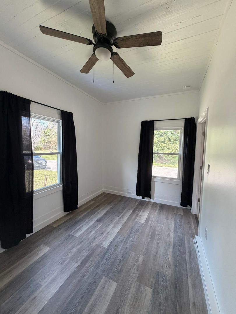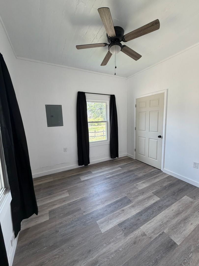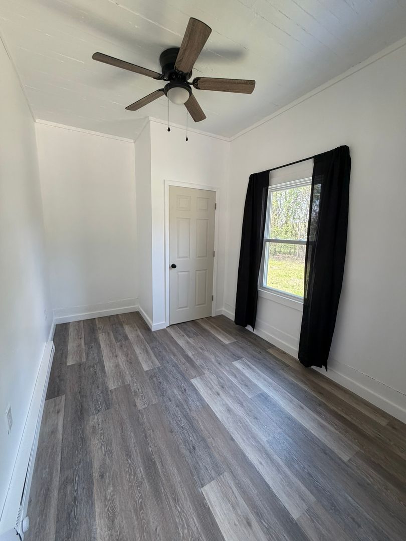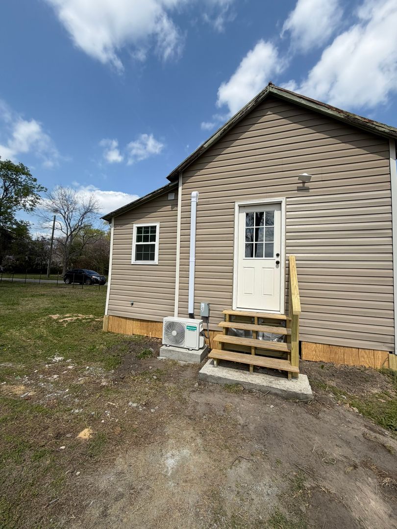 Located in Fayetteville, NC, this one-bedroom, one-bath home offers a comfortable layout with hardwood flooring and an eat-in kitchen featuring stainless appliances. The living room includes a ceiling fan, and temperature control is provided by a mini-split system and electric baseboard heating. A covered front porch adds outdoor shelter, and a laundry room with washer and dryer hookups provides convenient in-home laundry capability. Smoke alarms are installed for safety.