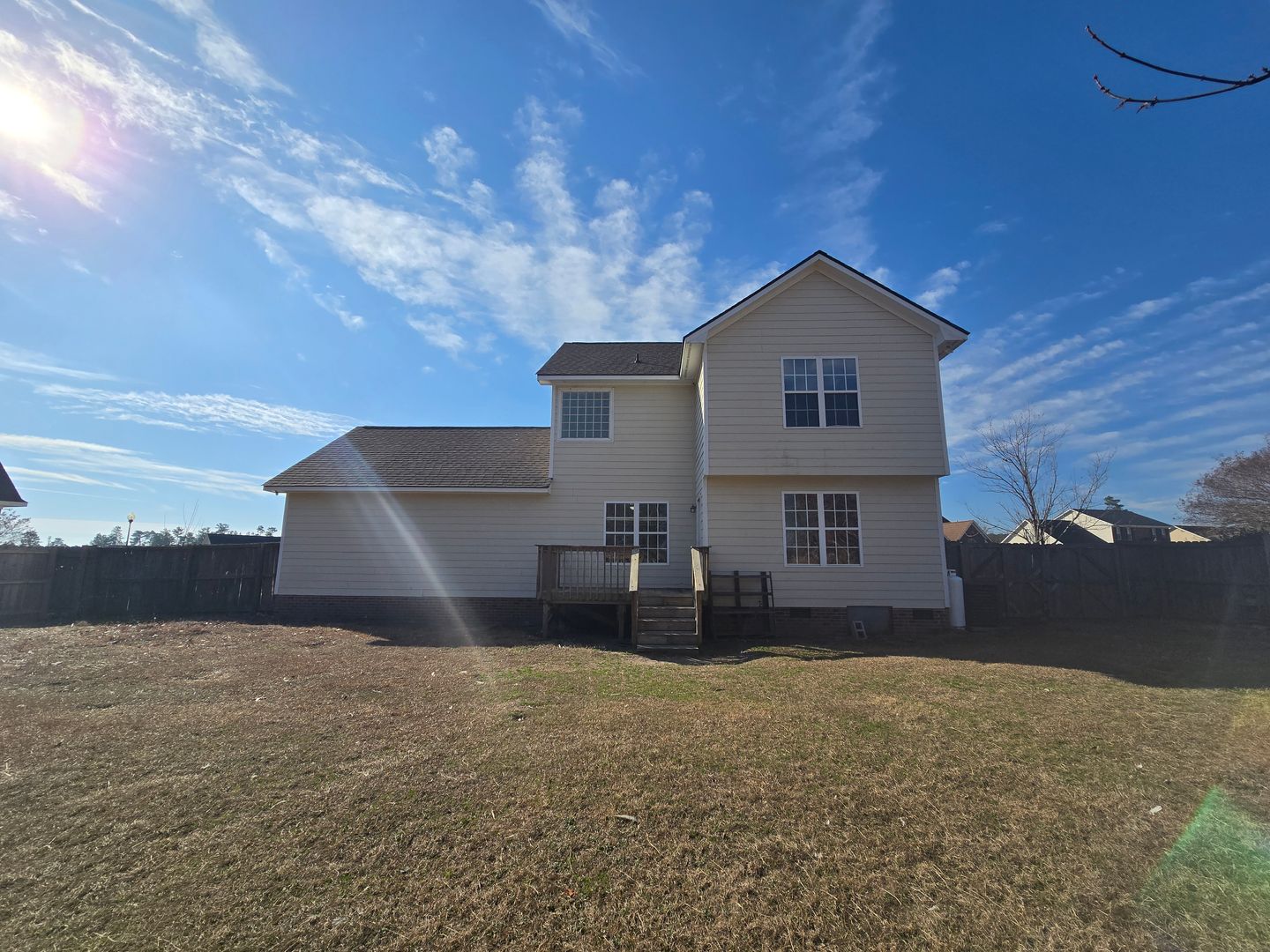 Welcome to this charming 3-bedroom, 2.5-bathroom home located in Hoke County, NC. This 2-story home is a perfect blend of comfort and style. Beautiful hardwood flooring flows through most of the downstairs. It includes a foyer, a formal dining room and features a gas log fireplace in the living room, perfect for cozy evenings. The kitchen with its breakfast nook comes equipped with a range, microwave, and a refrigerator. The primary bedroom is a true retreat with trey ceilings, a garden tub and separate shower for a spa-like experience. The laundry closet comes with a washer and dryer (NOT WARRANTED) for your convenience. This home also includes a heat pump for heating ¢tral a/c, plush carpeting in the bedrooms, smoke alarms, ceiling fans and a double car garage. The hardwood flooring and wainscot paneling add a touch of classic charm, while the unique wood and tin ceilings throughout the home add a rustic, yet modern appeal. Step outside to a privacy fenced backyard, perfect for outdoor activities or simply enjoying the fresh air. The deck and covered front porch provide additional spaces for relaxation or entertaining.