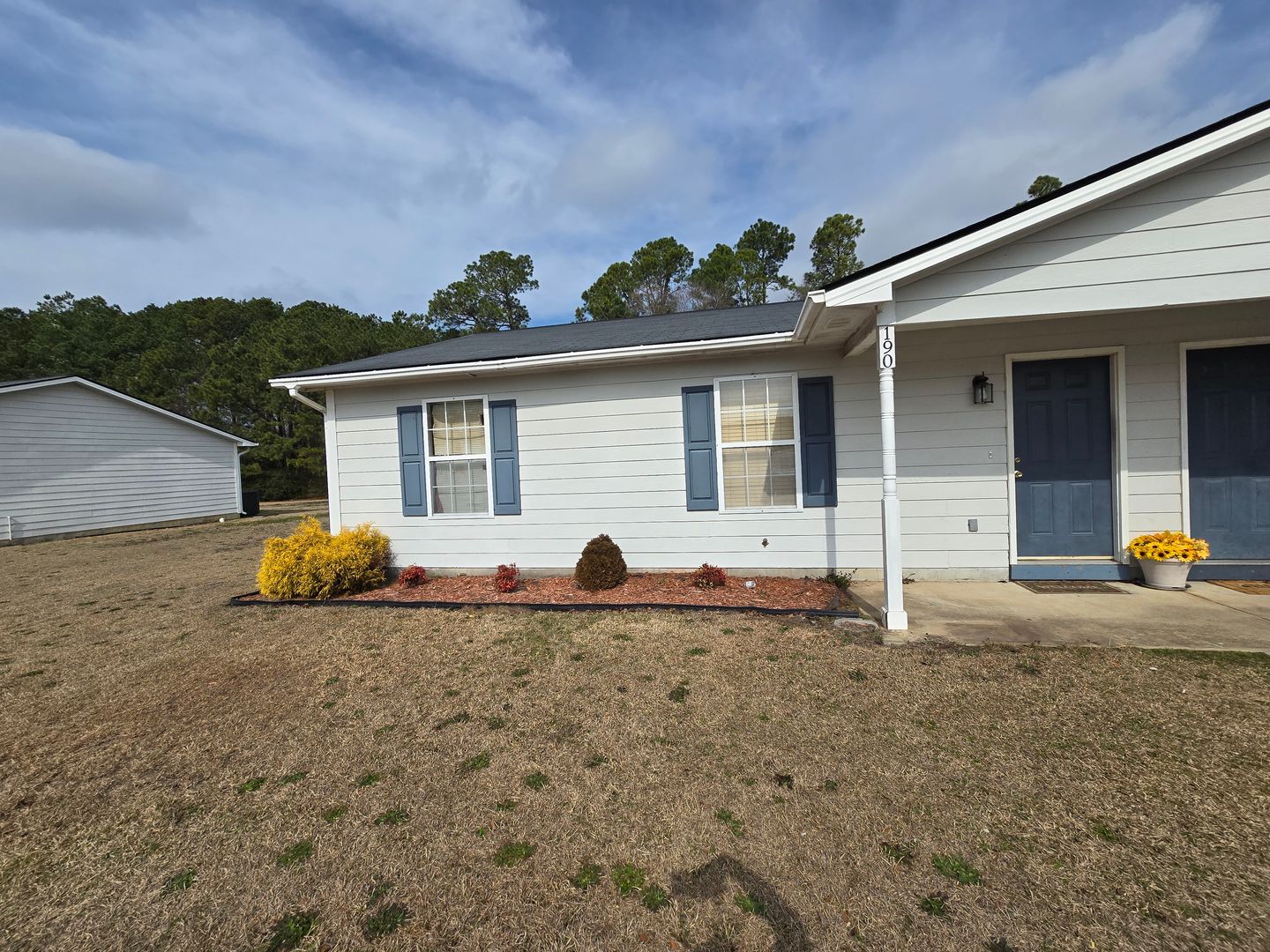 Charming 2-bedroom, 2-bath duplex in Raeford, NC featuring a covered front porch and a back patio for outdoor enjoyment. Inside, the eat-in kitchen includes a range, dishwasher, and refrigerator, with some window treatments throughout. The home offers carpet and tile flooring, ceiling fans, and an electric forced warm air heating system with central A/C. Convenient washer and dryer hookups and outside storage add practical utility, and smoke alarms are installed for safety.