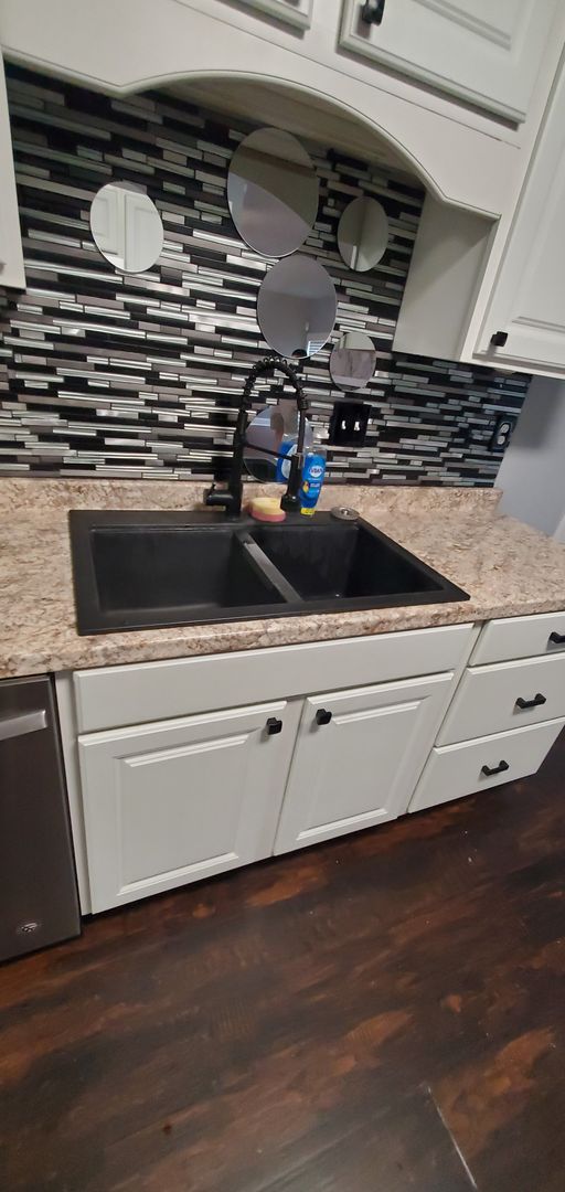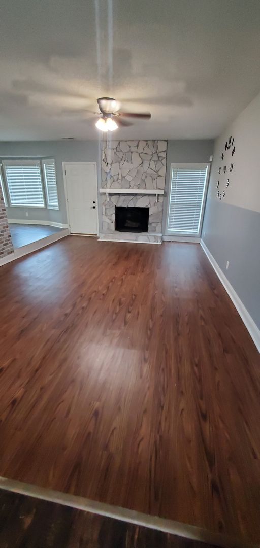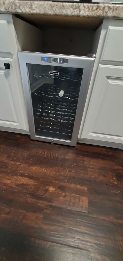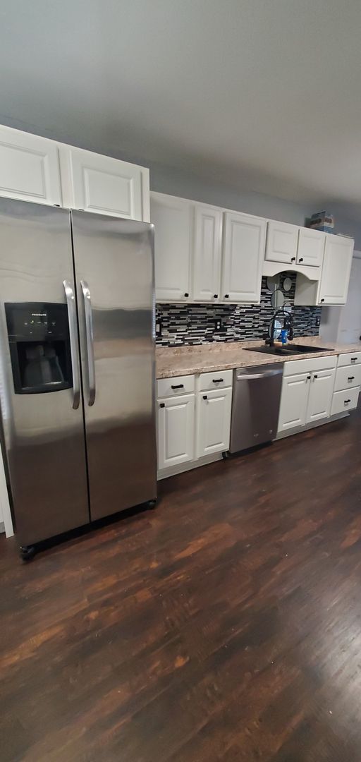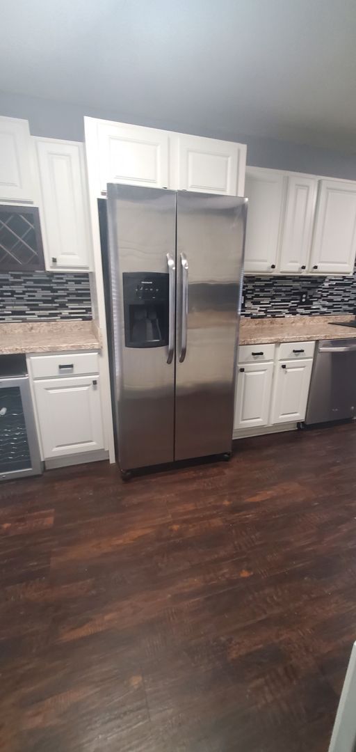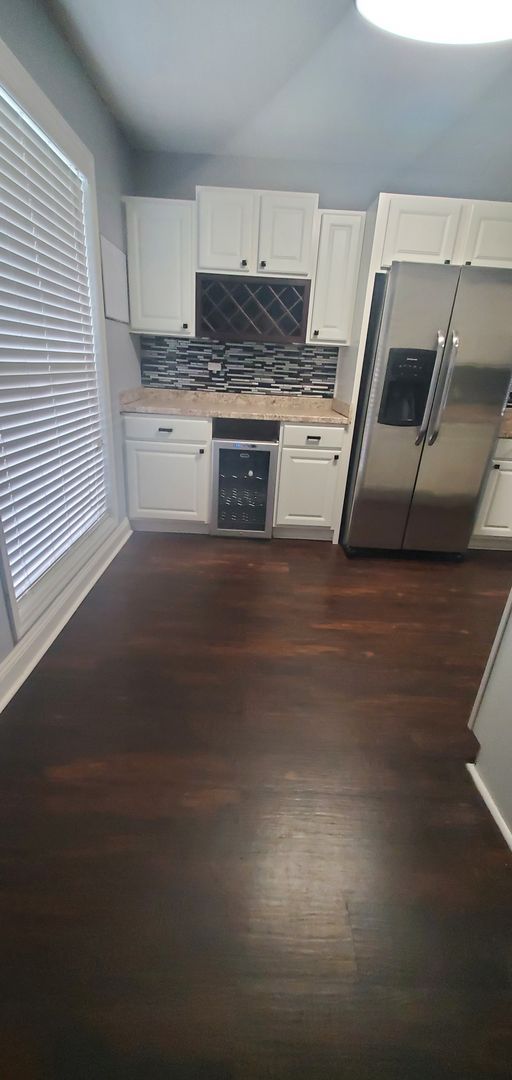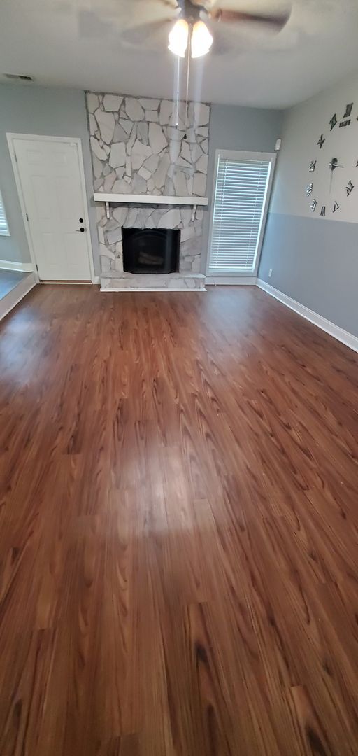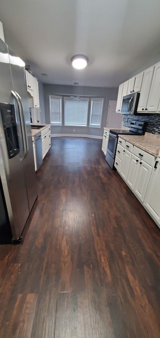 1401 Carnsmore in Arran Lakes in Fayetteville, NC is a 3-bedroom, 2-bath home blending practical layout with comfortable finishes. The covered front porch leads inside to a living room with a fireplace and a mix of hardwood and laminate flooring. The eat-in kitchen includes a range, refrigerator, microwave, dishwasher, tile backsplash and a wine fridge. The primary bedroom features a large closet; the home also offers ceiling fans, some window treatments, smoke alarms and a carbon monoxide detector. Laundry room with washer/dryer hookups and a single-car garage add convenience, while the fenced backyard and back patio provide outdoor space. Heating is provided by a heat pump and the home has central A/C. A security system is present (tenant responsibility).